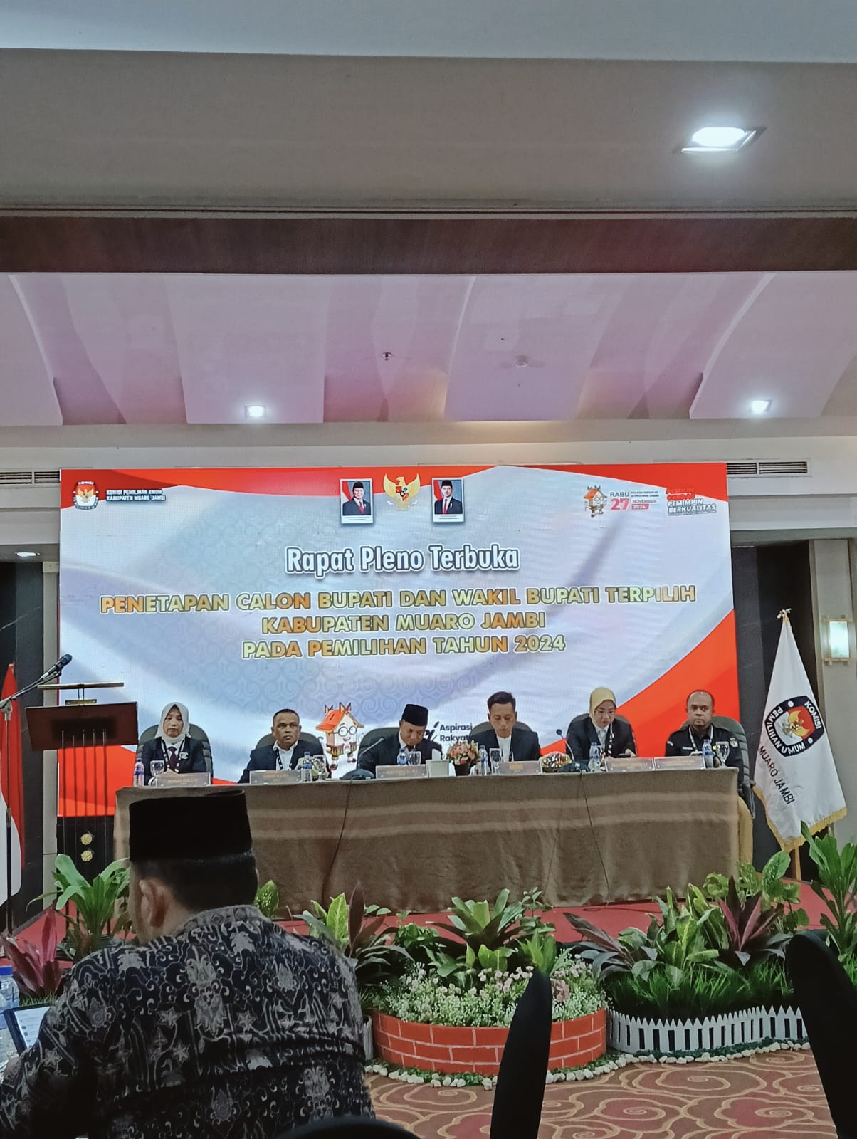 Harian Pagi Jambi.Com-Komisi Pemilihan Umum Kabupaten Muaro Jambi mengadakan Rapat pleno Penetapan Calon Bupati dan Wakil Bupati Terpilih Kabupaten Muaro Jambi Tahun 2024 bertempat di Sangratu Hotel , Rabu (5/2/2024)
