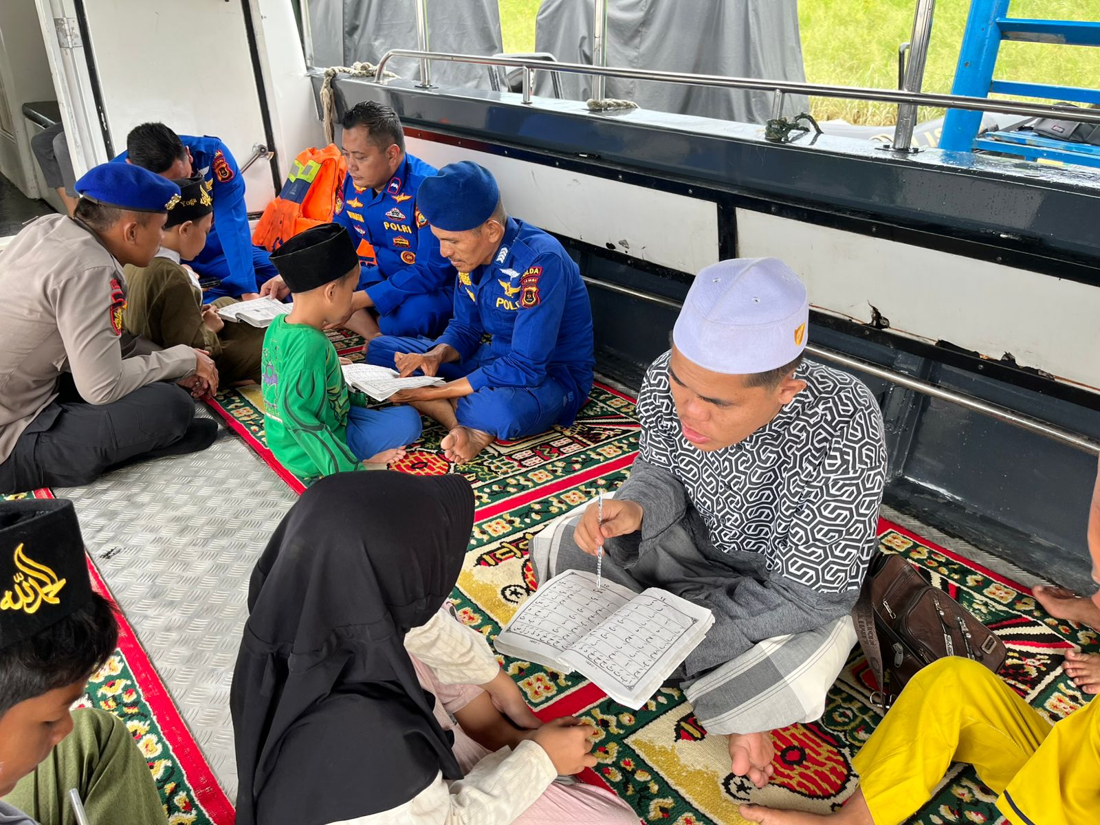 Kegiatan yang berlangsung di atas kapal Patroli KP. XXVI-2005 (LCT) ini dimulai pukul 16.00 WIB dengan agenda belajar mengaji bersama anak-anak Kelurahan Legok, Pulau Pandan Kota Jambi, Pembelajaran dipandu oleh ustadz Zulfahman dengan didampingi personel Ditpolairud Polda Jambi.